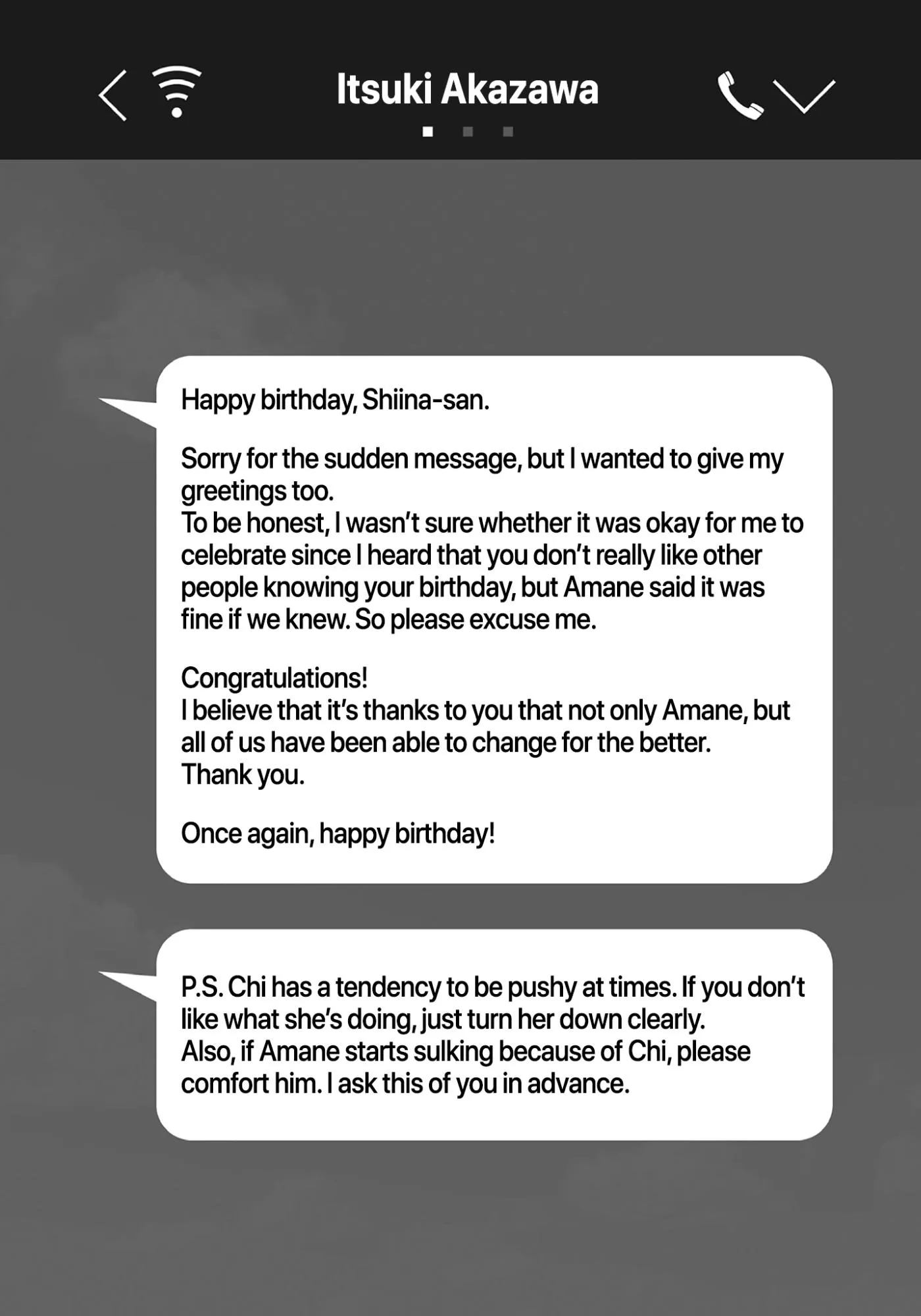 After parting ways with Mahiru, who’d apparently had some errands in the staff room, Amane entered the classroom only to be greeted by a grinning Itsuki. As Amane had expected, he’d instantly become the object of Itsuki’s teasing at school, just one day after his birthday. Incidentally, it looked like Chitose hadn’t arrived yet.
