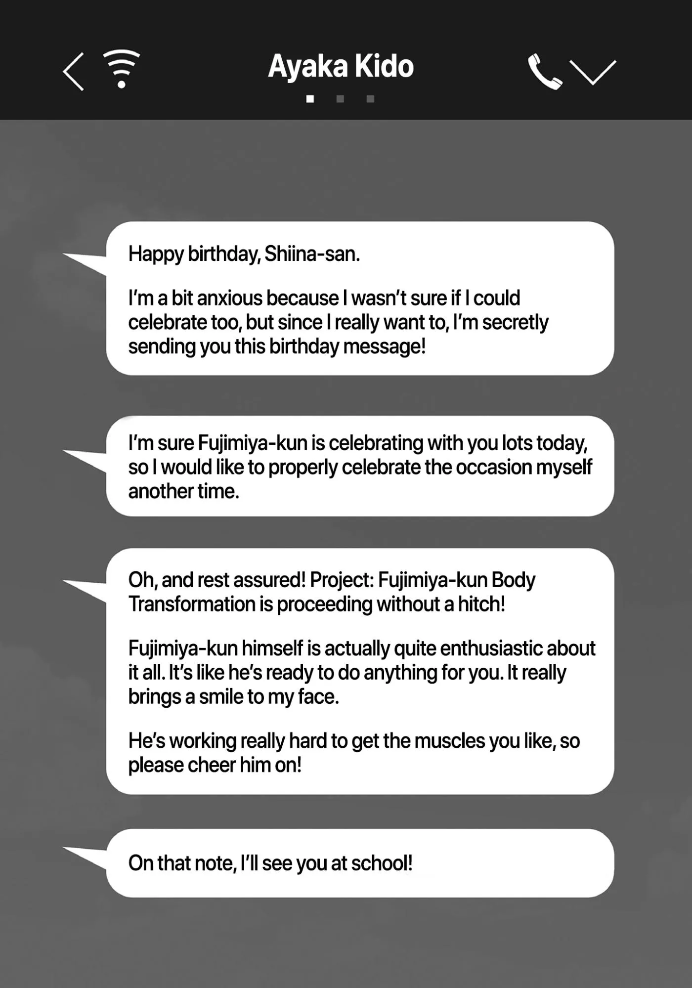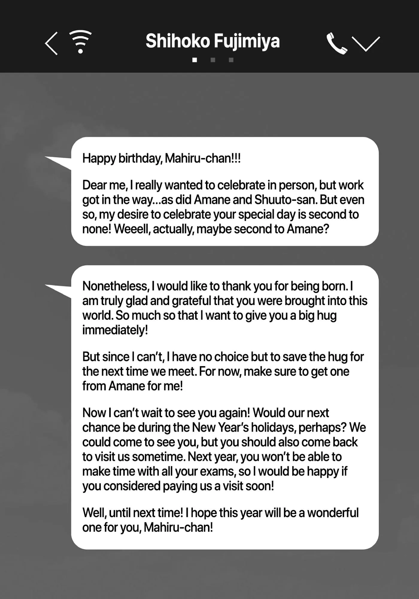 “Well, a surprise is what makes it all the more special, don’tcha think? I’m glad you had a memorable birthday. Once again, Happy Birthday.” Itsuki, being the considerate friend he was, smiled and gave Amane a pat on the shoulder again.