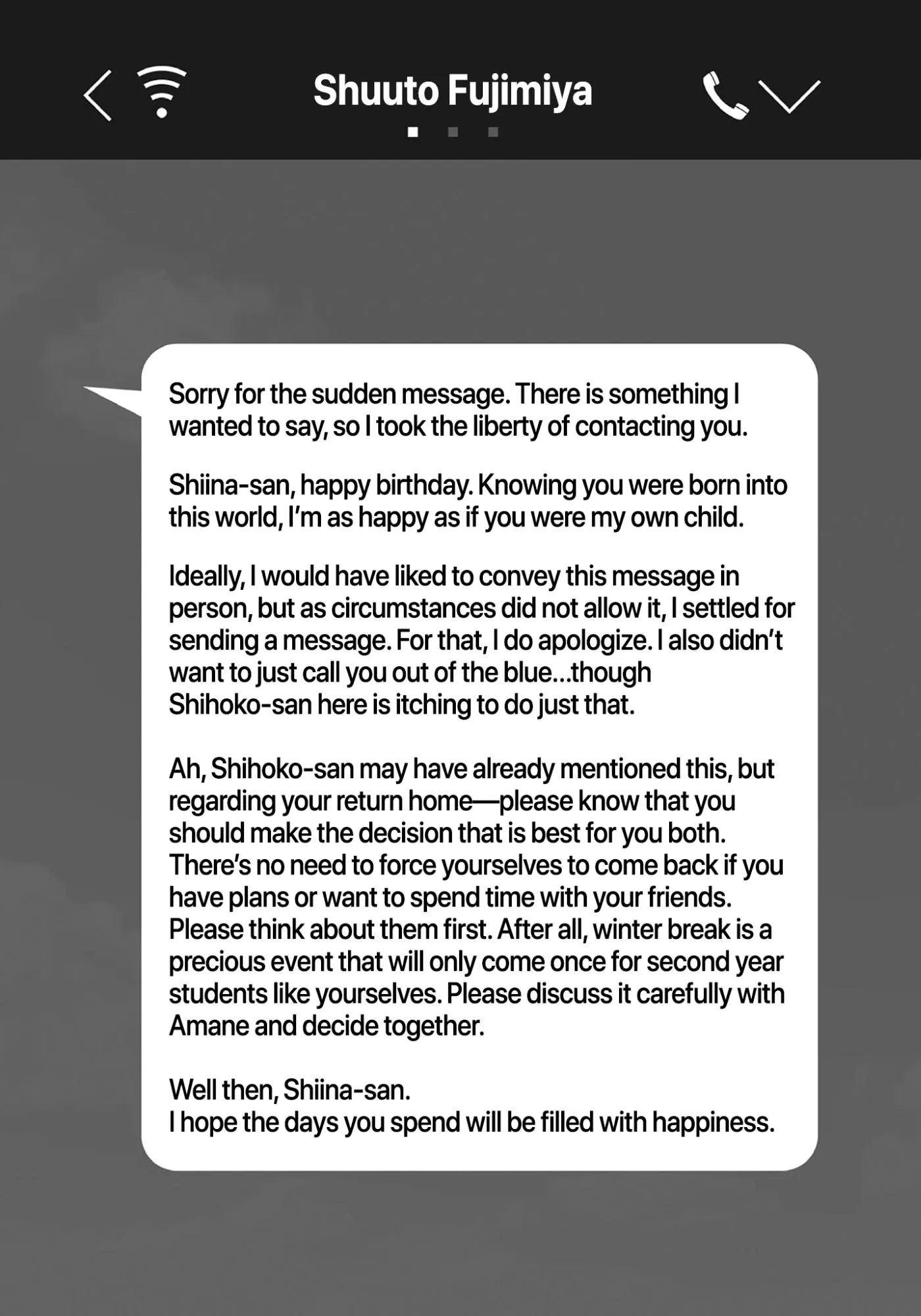 Itsuki noticed Amane’s raised eyebrow and patted his shoulder with a knowing grin. “Just kidding, man. Anyway, it looks like Shiina-san’s preparations went off without a hitch. I’m glad.”